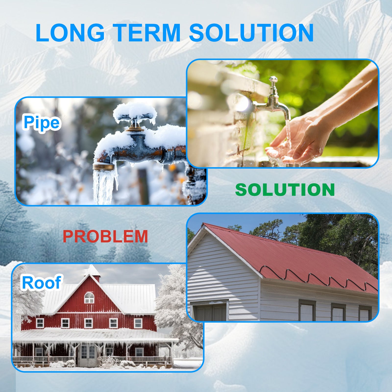 - 【Pipe Freeze Protection】 Our 5W/ft heat tape for water pipes, effective down to -40°F (-40°C), ensures water flow even in extreme temperatures. Ideal for both commercial and residential use, it protects plastic or metal water supply pipes from freezing during cold winters. From RVs to inlet pipes, drain pipes, sewers, and even palm tree frost protection, this versatile pipe heat tape covers pipes up to 2 1/2" in diameter.