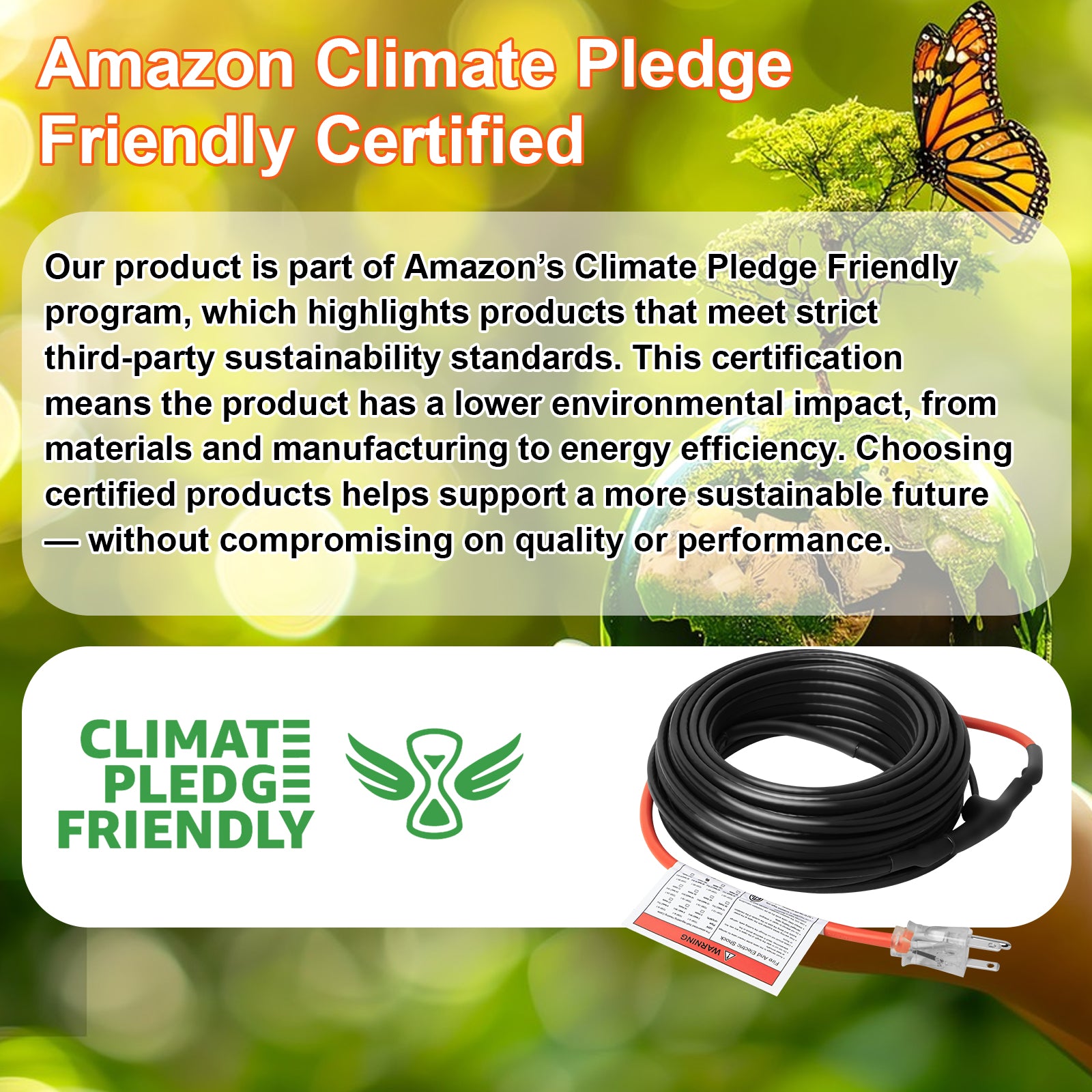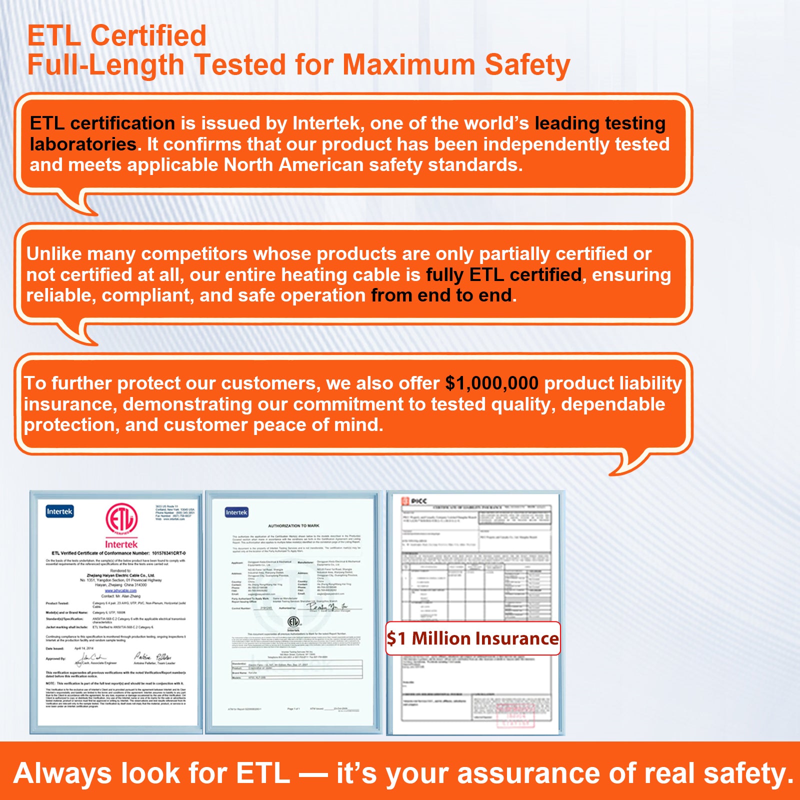 - [Fully Certified for Maximum Safety] Our self-regulating heating cable holds ETL certifications, meeting North America's strict safety and quality standards. Designed for top performance and reliability, the entire cable—not just the plug—is certified. The UL-certified plug adds extra protection. Plus, we provide $1 million in product liability insurance for added security. For true peace of mind, always choose a fully certified heating cable—partial certification isn't enough.