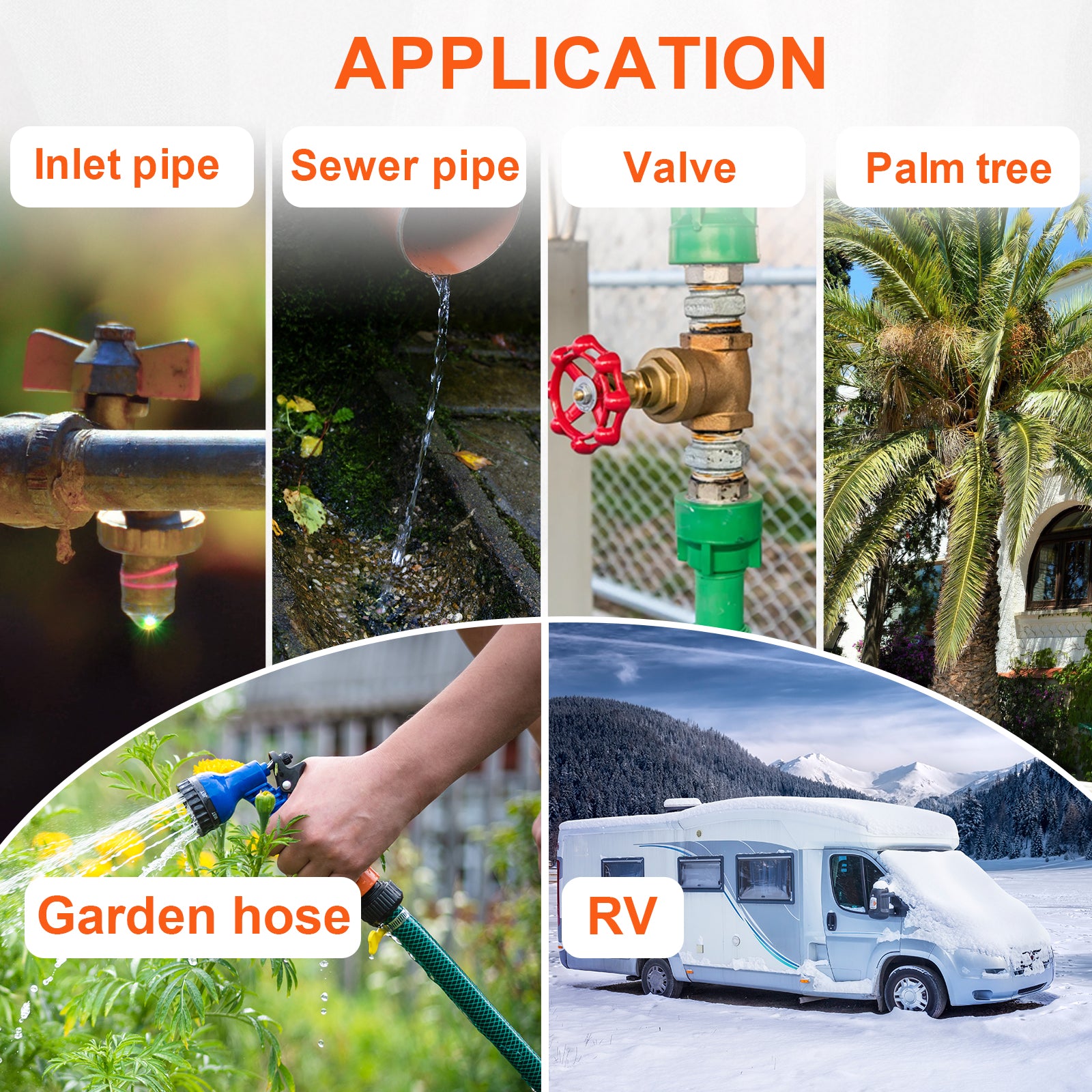 - [Easy to Install] Pre-assembled to use out of the box. Keep the cable straight-traced, spiral or overlapped on the pipe and valve, affix with a good electrical tape and insulation. The lowest installation temperature of the heating cable is 14℉. Secure the thermostat(plug end) tightly against the pipe(the coldest end of the pipe).